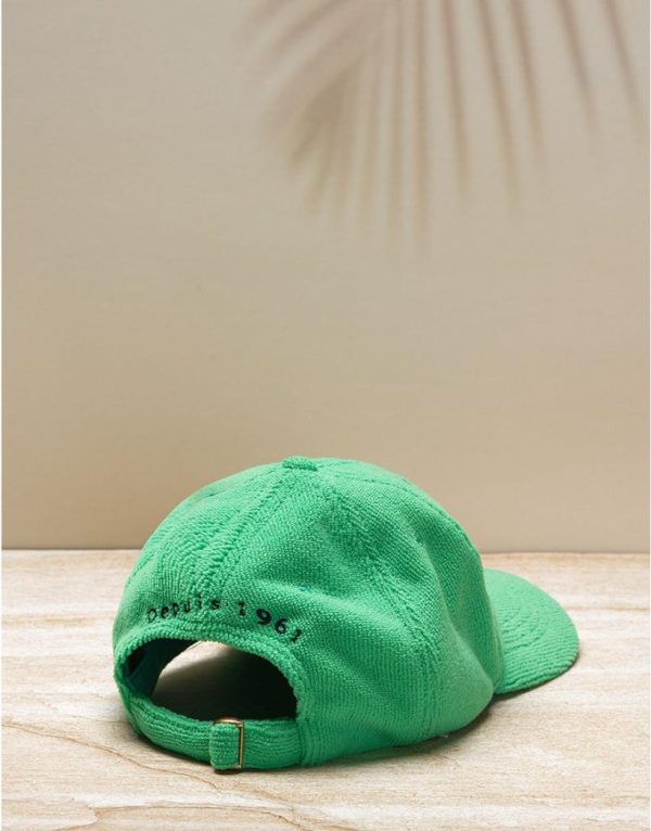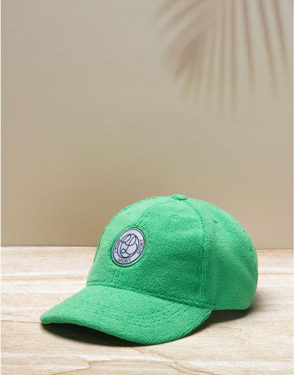 – La casquette en éponge vert, matière phare de l’été, se porte aussi bien