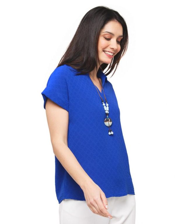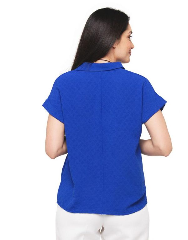 Le top effortless par excellence ! Il va à toutes les morphologies avec sa ligne d’une ampleur maitrisée et n’a pas son pareil pour donner une touche de peps à une tenue basique. Coupe droite et fluide, col polo ouvert sur le devant, petites manches à revers et une couleur renversante : que demander de plus ?