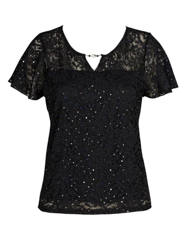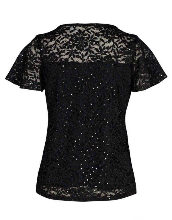 – Rien de plus chic qu’un top en dentelle noire irisée pour les fêtes! On aime la brillance maitrisée, la manche courte légèrement transparente et le col V féminin.