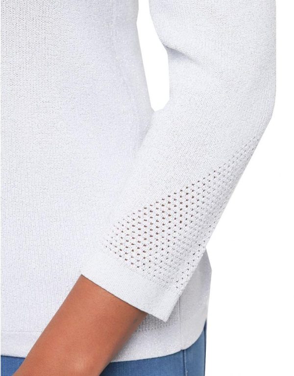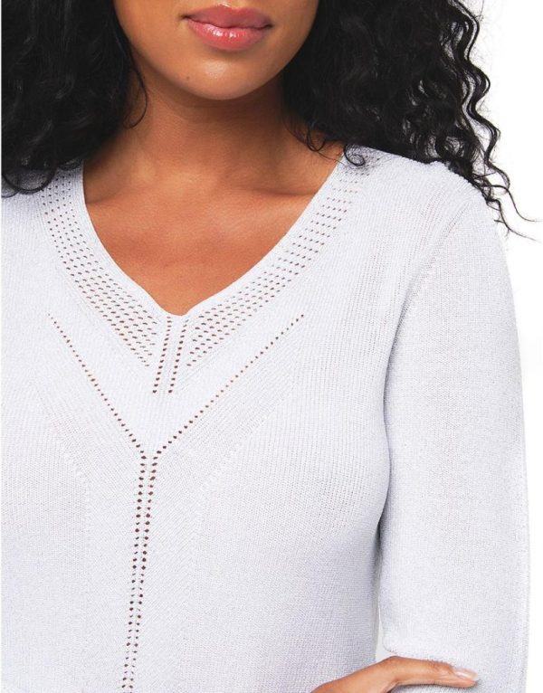 – Douceur et éclat pour le pull à col V tricoté dans une maille fantaisie à la couleur très seyante pour le printemps